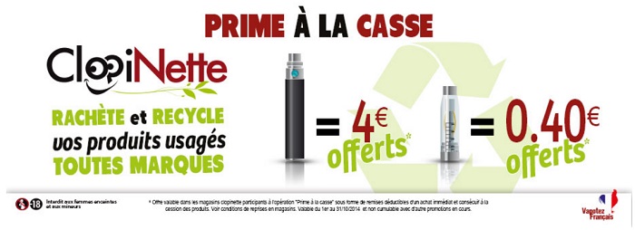 Tout au long du mois d’octobre, cette “prime à la casse” sera doublée : 4€ seront offerts par batterie, et 0,40€ par clearomiser. Pour communiquer sur l’opération, Clopinette a choisi de réaliser une campagne radio sur RFM, mais aussi emailing, animation, jeux et quizz sur la page Facebook de l’enseigne.