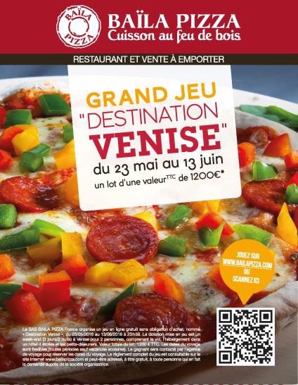 Fidèle à la tradition d’animation de ses restaurants, le réseau Baïla Pizza organise un nouveau jeu concours à l’intention de ses clients. Lancée le 23 mai, l’opération permettra à l’un d’entre eux de s’envoler à Venise pour un week-end avec la personne de son choix.