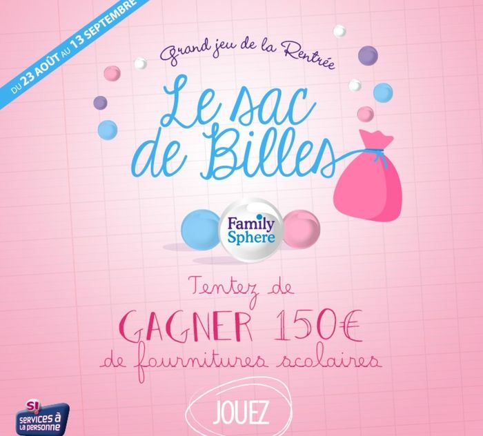 Au total, dix virements de 150€ sont mis en jeu pendant toute la durée du concours. Un concours qui se terminera le 13 septembre prochain et se déroule actuellement sur la page Facebook de l’enseigne Family Sphère. Le principe est simple : les internautes doivent se rendre sur cette page et, une fois leurs coordonnées remplies, cliquer sur l’une des trois billes qui apparaissent à côté du sac de billes. Si la bille choisie porte le logo de la marque, c’est gagné !
