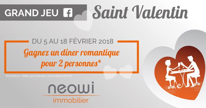 Le réseau immobilier Neowi profite de la Saint Valentin pour offrir un beau cadeau aux amoureux : un repas romantique est à gagner sur les pages Facebook de ses agences.