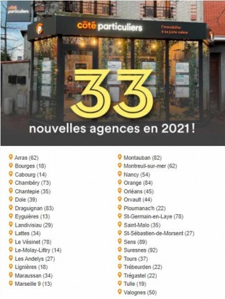 En 2021, le réseau Côté Particuliers a ouvert 33 nouvelles agences. L’enseigne est désormais présente dans les villes de :