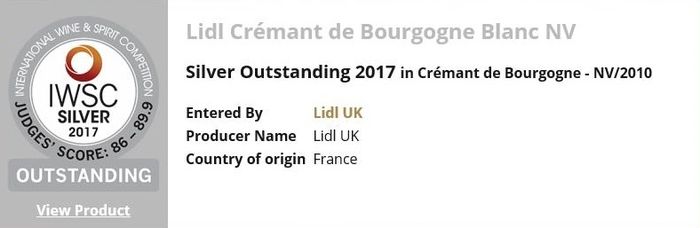 Selon les experts qui ont établi ce classement portant sur de nombreuses bouteilles de différents alcools, le Crémant de Bourgogne Blanc NV 2010, vendu un peu moins de 10€ chez Lidl serait largement aussi bon qu’un Veuve Clicquot 2008 Vintage, vendu 56€ la bouteille. Le jury, qui lui a décerné une note entre 86 et 89,9, lui a même attribué le titre honorifique de Silver Outstanding, mettant en avant les « intrigants arômes de fruits confits, en particulier l’angélique » qui l’ont particulièrement séduit lors de la dégustation.
