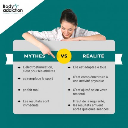 Réalité : L’idée que l’électrostimulation ne sert qu’à renforcer les muscles sans avoir un effet sur la perte de graisse est un mythe courant. En réalité, l’EMS, lorsqu’elle est combinée à une alimentation équilibrée et à une activité physique régulière, peut contribuer à la réduction des graisses.