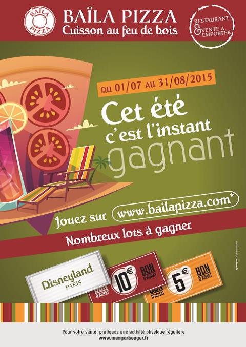 Plus que quelques jours avant le lancement du grand jeu d’été de Baila Pizza ! Dès le 1er juillet, les internautes pourront tenter leur chance sur le site de l’enseigne et essayer de remporter l’un des lots mis en jeu. A la clé pour les heureux gagnants, quatre entrées gratuites pour Disneyland Paris ou des bons d’achat de 5 et 10€, valables dans les restaurants Baila Pizza participants.