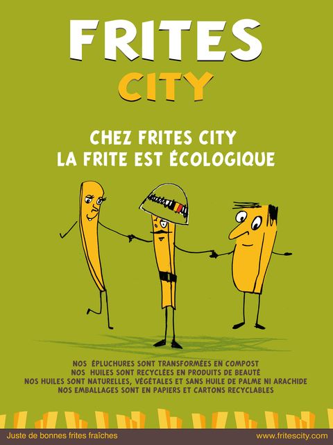 | Des épluchures qui finissent au compost, des huiles de friture recyclées qui se transforment en produits de beauté, des emballages réalisés à partir de papier et cartons recyclables…. Chez Frites City, l’écologie n’est pas un vain mot ! Et pour sensibiliser l’ensemble de sa clientèle à cette question, l’enseigne de restauration rapide a choisi de communiquer largement sur cet aspect. De grandes affiches vertes annoncent donc la couleur, expliquant aux consommateurs tous les efforts fournis par le réseau Frites City pour leur proposer des produits respectueux de la nature. |