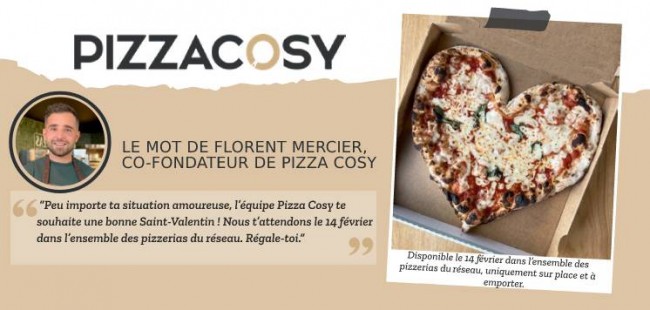 Florent Mercier, co-fondateur de Pizza Cosy, s’adresse à ses clients : « Peu importe ta situation amoureuse, l’équipe Pizza Cosy te souhaite une bonne Saint-Valentin ! Nous t’attendons le 14 février dans l’ensemble des pizzerias du réseau. Régale-toi ».
