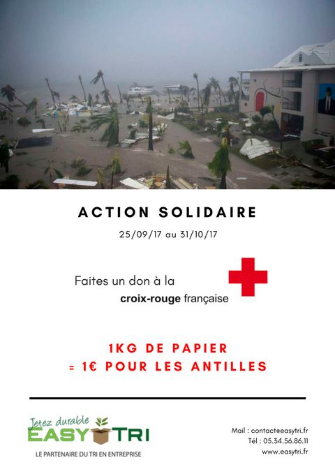 Pour soutenir les actions de la Croix Rouge dans les iles de Saint-Martin et Saint-Barthélémy, EASYTRI a mis en place l’opération « 1 kilo = 1 euro ». Concrètement, l’enseigne propose aux entreprises qui souhaitent participer de collecter et recycler leurs déchets papiers en contrepartie du reversement à la Croix Rouge française d’un don de 1€ par kilo de papier collecté. L’opération « 1 kilo = 1 euro » d’EASYTRI se déroule du 25 septembre au 31 octobre 2017 et l’enseigne elle-même y prend part.