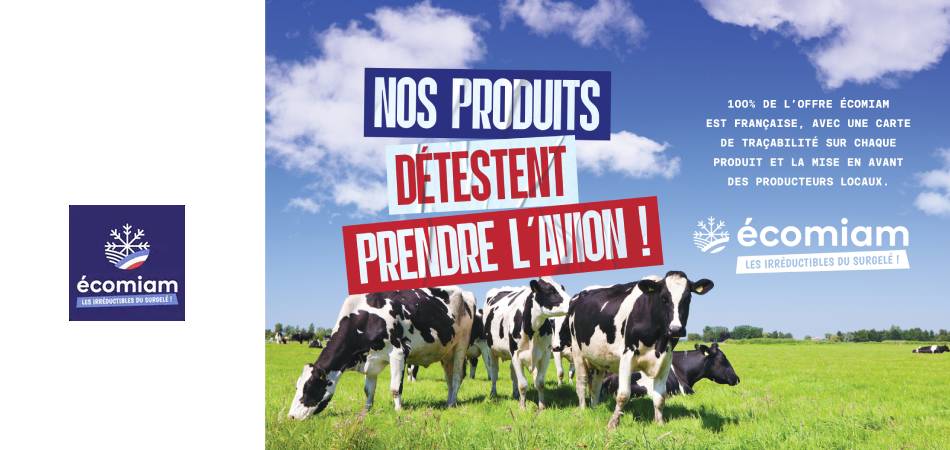 Des accroches engagées, traitées comme des affiches collées aux couleurs bleu, blanc, rouge, viennent illustrer les dérives d’un système alimentaire qui ne fonctionne plus. Elles donnent le ton et incarnent pleinement le combat porté par la marque écomiam, déterminée à défendre durablement les filières françaises de production.