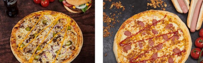 - La pizza hot-dog, composée de saucisse de bœuf, de mozzarella fraîche, d’oignons frits et de filets de moutarde et ketchup.
