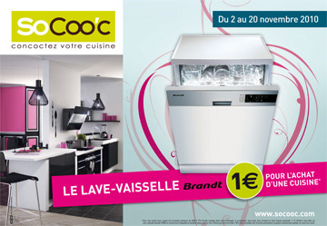 Toute acquisition d’une cuisine SoCoo’c d’une valeur minimum de 2500 euros (TTC meubles, hors électroménager et accessoires, hors pose, hors livraison, hors travaux annexes) offre la possibilité au consommateur, pour un euro de plus, de la voir équipée d’un lave-vaisselle VH900 de la marque Brandt (d’une valeur maxi de 536 euros TTC, disponible en 4 versions : bandeau blanc, inox ou noir ou version full intégrale).