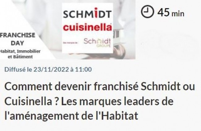 L’enseigne Cuisinella profitera du prochain Franchise Day, consacré à l’habitat, à l’immobilier et au bâtiment, le 23 novembre, pour mettre en avant son concept et sa stratégie de recrutement. Véronique Robert, chargée de recrutement concessionnaires Schmidt et Cuisinella, et Philippe Muguet, responsable expansion de ces deux enseignes, interviendront au cours de ce webinaire.