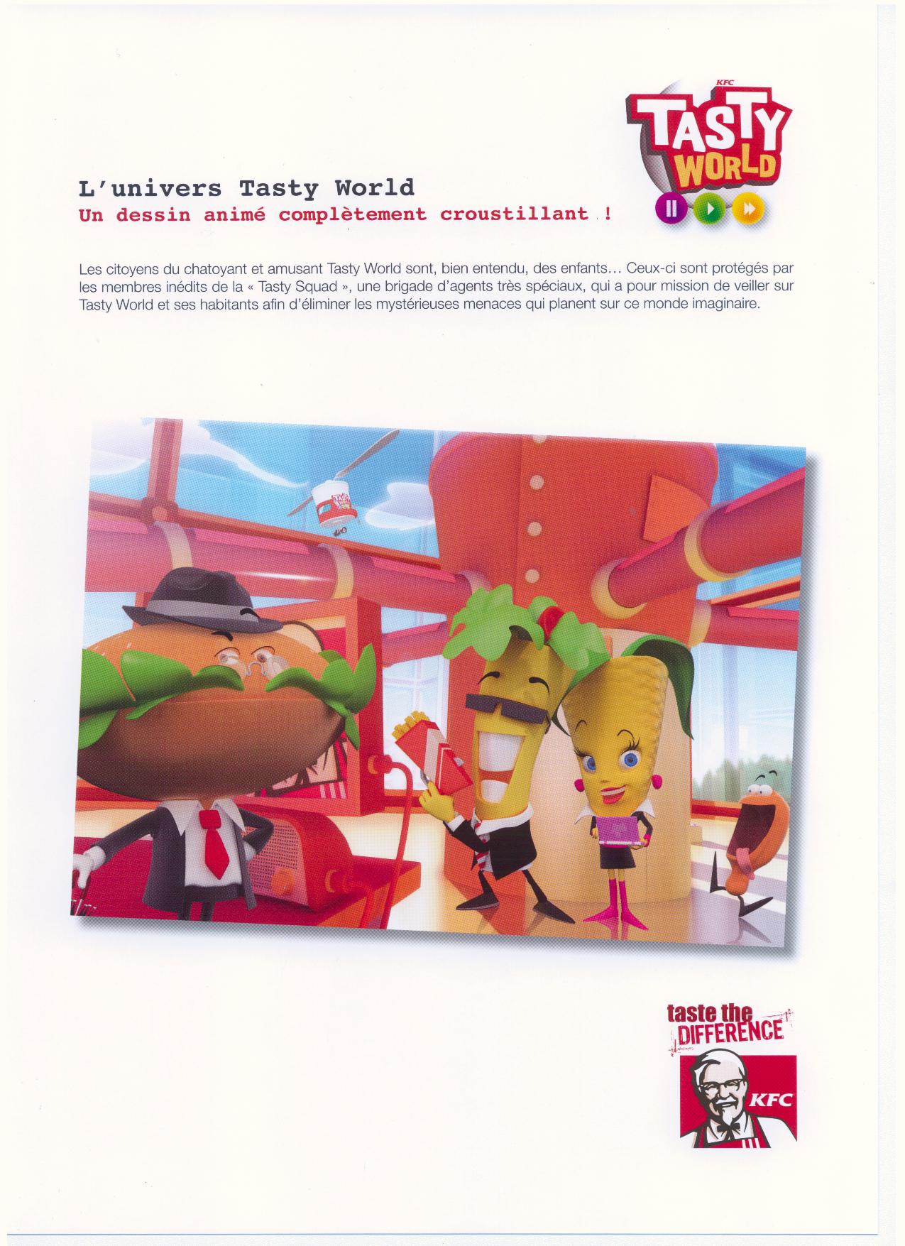 TASTY WORLD est un nouvel univers unique en son genre « made in KFC », à la fois original et ludique. Il propose aux parents et aux enfants de nouveaux produits et services qui s’appuient sur 3 valeurs chères à KFC : le goût, la sensation et la soif de découverte. Celles-ci sont représentées dans un dessin animé décalé et original : une première dans la restauration.