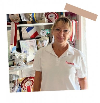 " J’ai connu la marque HUSSE en 2006 lors du salon Equita Lyon. Je me suis arrêtée sur le stand par curiosité et j’ai longuement discuté avec Bernard Pinzetta, franchisé Husse, qui m’a présenté la marque et les produits. Ayant un élevage familial de Boxers et j’ai pu faire goûter les échantillons à mes chiens, ainsi qu’à mes 2 chats. Convaincue par les produits, je suis devenue cliente. Par la suite, Bernard m’a parlé de la possibilité de devenir VDI ; c’est à ce moment-là que j’ai rejoint la Team Husse dans l’Isère.