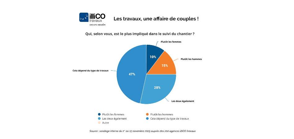 Concernant le suivi de chantier, dans près d’un tiers des situations, les deux membres s’impliquent de manière équivalente. Le plus souvent, l’implication dépend de la nature des travaux. « Coté suivi de travaux, les femmes s’impliquent davantage dans les travaux de décoration ou d’aménagement intérieur, le choix des couleurs, des matériaux également, quand les hommes sont surtout impliqués dans les aspects techniques ou structurels. Finalement, une fois que les choix sont faits, le suivi de chantier se déroule plutôt sans trop de soucis » résume Thierry Abriat.
