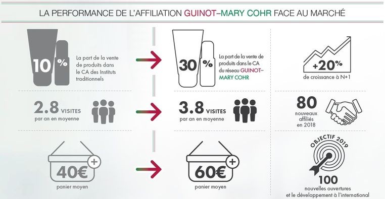 L’infographie spécialement créée par le groupe leader des instituts de beauté en France à l’occasion de l’ouverture de sa 320e unité met en avant toute la performance de Guinot – Mary Cohr sur son marché. On apprend notamment que la vente de produits, qui représente en moyenne 10% du chiffre d’affaires des instituts de beauté traditionnels, s’élève à 30% dans les centres du réseau. Une différence considérable à prendre en compte pour les créateurs d’entreprise qui souhaitent se lancer sur le marché de la beauté ! Autre différence notable : là où les instituts traditionnels enregistrent en moyenne 2,8 visites anuelles par cliente, chez Guinot – Mary Cohr, ce chiffre monte à 3,8 visites. Même constat au niveau du panier moyen, qui est de 60€ dans le réseau, contre 40€ dans le reste des instituts.