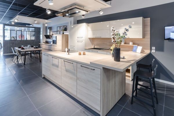 - La zone avec les cuisines d’expositions, qui fait le tour du magasin et qui permet aux clients de s’inspirer, de voir les différents types d’implantations, combinaisons de matériaux et modèles existants.