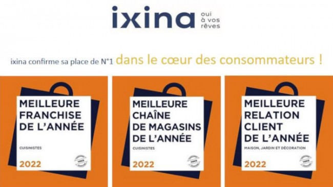 A l’occasion de la plus grande enquête de consommateurs de France, l’enseigne Ixina a obtenu pour la 4ème année consécutive le trophée de la « Meilleure Chaîne de Magasins » 2022 dans la catégorie « Cuisine » mais aussi deux autres prix.