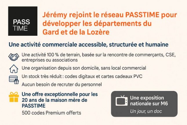 Le réseau national PASSTIME poursuit son développement territorial avec l’intégration prochaine de Jérémy, nouveau franchisé qui prendra en charge les secteurs du Gard (30) et de la Lozère (48). Avec cette double implantation, l’enseigne renforce sa présence en Occitanie tout en s’appuyant sur un profil motivé, ancré localement.