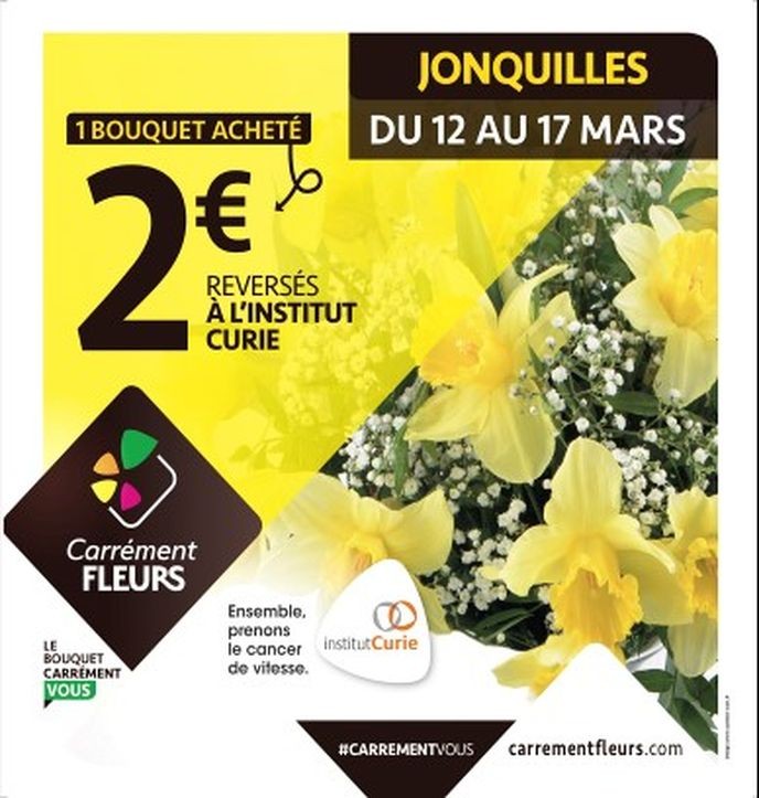 Pour s’associer à cette opération, les clients n’ont en effet rien de plus à faire qu’acheter un bouquet de jonquilles dans l’un des magasins Carrément Fleurs ou sur le site internet de l’enseigne. 2€ seront alors reversés, sur chaque bouquet acheté entre le 12 et le 17 mars 2019, à l’institut Curie.