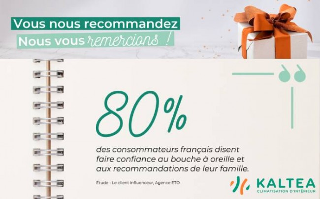 Le réseau spécialisé dans l’installation, la maintenance et le dépannage de climatisation réversible et pompe à chaleur KALTEA a depuis son lancement, soigné son service clientèle pour offrir une prestation de qualité. Grâce à un taux de satisfaction avoisinant les 100%, KALTEA lance un programme de parrainage pour remercier ses clients.
