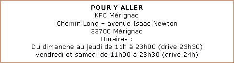 KFC continue son développement dans la région bordelaise. Fort du succès de ses deux implantations à Bordeaux Sainte Catherine et Villenave d’Ornon, l’enseigne ouvre son nouveau restaurant à Mérignac. **Un emplacement idéal, de nombreux équipements Situé dans la zone d’activités commerciales de Chemin Long, le nouveau KFC de Mérignac offre une capacité d’accueil de 152 places réparties sur une surface de 400 m² ainsi qu’une terrasse pouvant accueillir 182 personnes. Par ailleurs, le restaurant KFC propose un service au volant ouvert jusqu’à 23h30 ou minuit selon les jours. Tout a été conçu pour permettre un accès facile aux personnes handicapées et la terrasse offre une aire de jeux pour enfants. 40 emplois créés au niveau local KFC a confié la direction de ce nouveau restaurant à Saadi Youssef. Pour cette ouverture, KFC a créé 40 nouveaux emplois en étroite collaboration avec les services municipaux, les missions locales pour l’emploi et l’ANPE. La totalité des postes proposés par KFC sont des CDI régis par la convention collective de la restauration rapide.