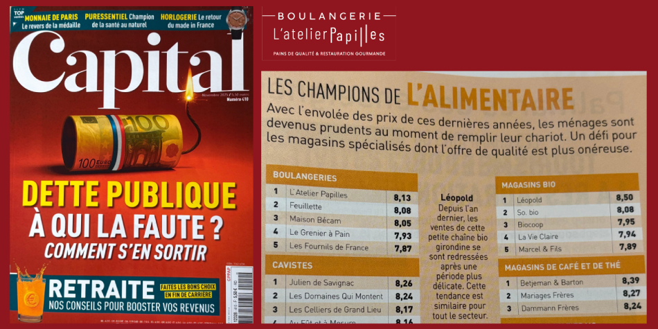 L’atelier Papilles a été désignée « meilleure enseigne », avec une note de 8,13 / 10, à l’issue d’une enquête menée par l’institut d’études Statista pour le magazine Capital.