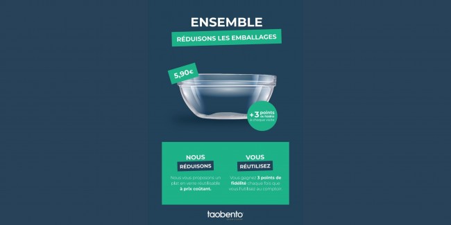 taobento propose désormais à ses clients d’acquérir un contenant en verre réutilisable à prix coûtant : le bento disponible dans tous les restaurants du réseau. Cette initiative s’inscrit dans le cadre de sa nouvelle démarche RSE afin de réduire l’utilisation d’emballages plastiques très polluants pour la planète. Une fois acheté, le client peut revenir avec son contenant autant de fois qu’il le souhaite et reçoit 3 points de fidélité crédités sur son compte à chaque utilisation de son bento.