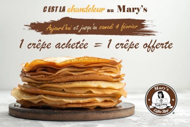 Tout le monde fête la Chandeleur en mangeant des crêpes mais chez la franchise Mary’s Coffee Shop la fête est double. En effet, et à cette occasion, elle lance une offre appétissante : 1 crêpe achetée = 1 crêpe offerte.