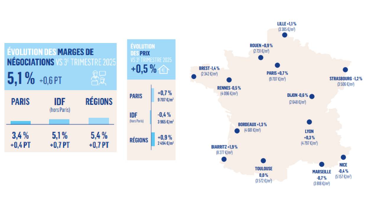 Côté prix, la tendance reste à la stabilisation avec une hausse modérée de +0,5 % au niveau national. À Paris, les prix progressent de +0,7 % pour atteindre 9 707 €/m², tandis qu’ils reculent légèrement en Île-de-France (-0,4 %) et progressent en régions (+0,9 %). Les écarts entre villes restent marqués, certaines comme Bordeaux ou Lille étant plus dynamiques que d’autres.