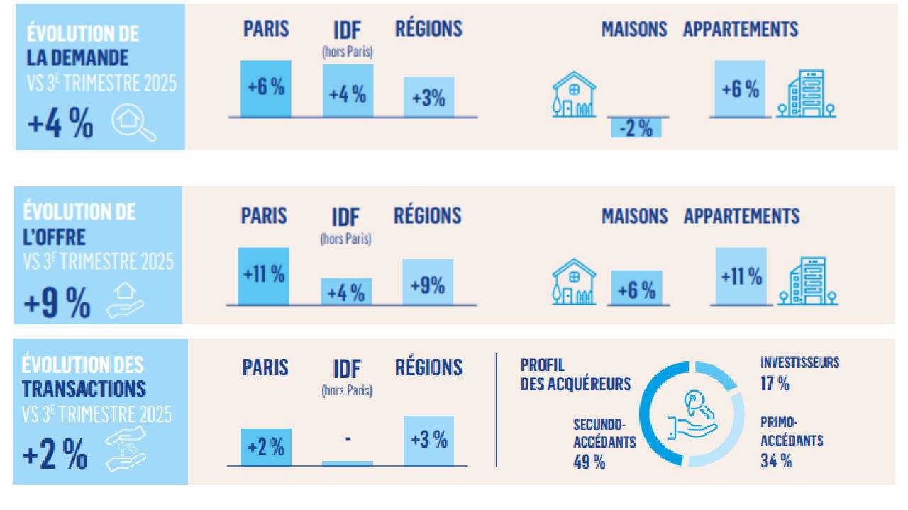Face à cette demande, l’offre accélère nettement. Elle progresse de +9 % en trois mois au niveau national, avec +11 % à Paris, +9 % en régions et +4 % en Île-de-France. Les vendeurs reviennent sur le marché, convaincus que les conditions sont à nouveau réunies pour concrétiser leur projet.