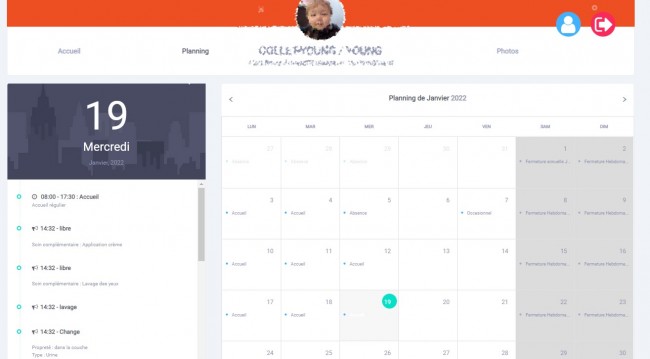 - Accès au planning avec le calendrier des jours de présence prévus de l’enfant et les horaires de garde, ainsi que le suivi en temps réel de l’emploi du temps de la journée