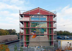 Le spécialiste des menuiseries extérieures sur mesure Clair de Baie a inauguré le 14 décembre 2011 son nouveau siège social. En plus des bureaux, celui-ci compte désormais un centre de formation pour les franchisés et leurs collaborateurs, ainsi qu’un showroom de 150 m² pour valoriser les produits de l’enseigne, à visiter sur rendez-vous. Installé le long de la très passante autoroute A7 à l’entrée sud de Lyon, le bâtiment à l’avantage d’être particulièrement visible grâce à une immense fresque intitulée “Fenêtre sur Confluent”, réalisée par CitéCréation. Joliment mise en lumière la nuit, la fresque devrait aider Clair de Baie à gagner en notoriété. Pour Théophane Courau, dirigeant de Clair de Baie, il s’agissait, grâce à cette réalisation représentant le confluent des deux fleuves de la ville, de " mettre en image notre discours commercial, celui du point de rencontre entre les attentes de nos clients, l’étendue de notre offre sur-mesure inédite, et le savoir-faire de nos installateurs".
