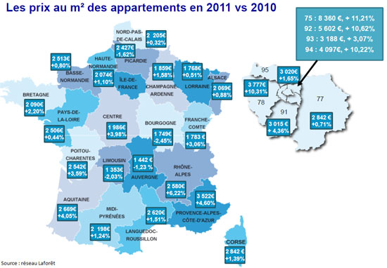 Le rapport émit par le réseau Laforêt détaille l’état du marché région par région avant de se projeter sur l’année 2012. Pour le réseau Laforêt, le marché immobilier va devoir se passer des incitations fiscales encore en vigueur en 2011 et supporter la prudence des banques qui entraine une moindre solvabilité des acquéreurs. Pour ces raisons, Laforêt s’attend à une période d’immobilisme durant la première moitié de l’année. Une situation qui devrait entrainer une baisse manifeste des prix jusqu’à 10%.