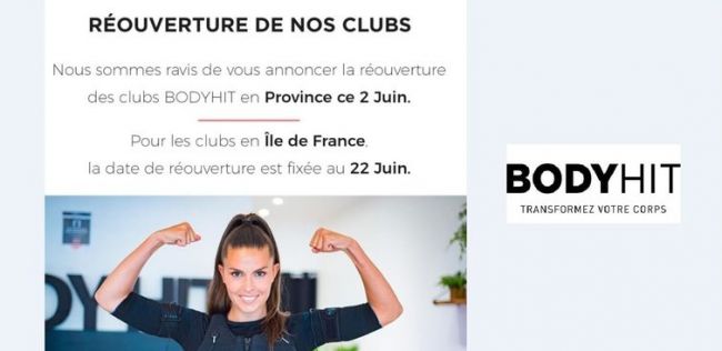 Le concept BODYHIT mêle en effet coaching rapproché et électrostimulation, pour des résultats rapides et durables. Qu’il s’agisse de perte de poids, de raffermissement ou de renforcement musculaire, la technologie Miha Bodytec utilisée dans les centres BODYHIT offre l’équivalent de 4 heures de sport en 20 minutes d’exercice. Autant dire que la réouverture des centres était attendue avec impatience par les adeptes de cette méthode ! Depuis le 2 juin, ces salles de fitness EMS rouvrent progressivement leurs portes en province. En Ile de France, il faudra attendre le 22 juin pour pouvoir retourner faire une séance de sport par électrostimulation.