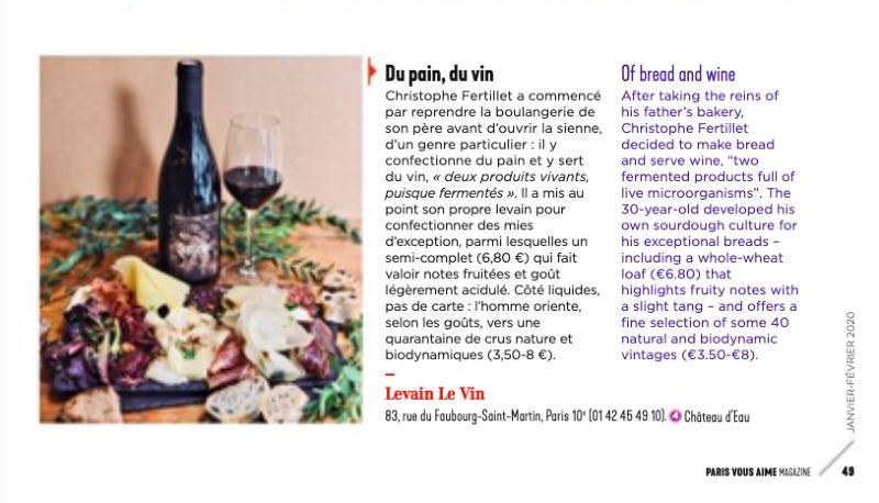 Le concept Levain, Le Vin a séduit la rédaction du magazine Paris vous aime, distribué par les aéroports de Paris, qui l’a intégré à sa sélection de bonnes adresses.