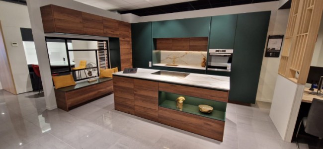 Les co-franchisés ont choisi de mettre en scène sept cuisines incarnant l’esprit Cuisine Plus ainsi que les dernières tendances en matière de design, d’ergonomie et de fonctionnalité. Un espace salon au style lounge, agrémenté d’écrans immersifs, invite les visiteurs à une expérience visuelle captivante. À l’entrée, une réception de trois places crée une atmosphère chaleureuse et propice aux échanges.