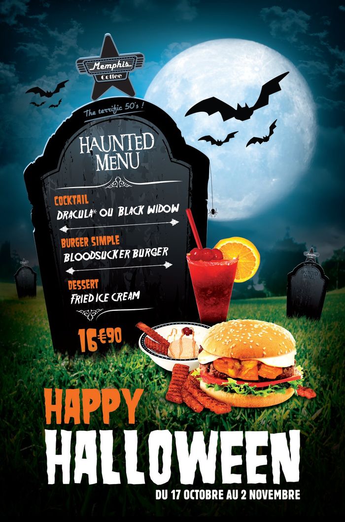 | Memphis Coffee dévoile un menu original à l’occasion d’Halloween : le Haunted Menu ! Proposé du 17 octobre au 2 novembre au prix de 16,90€, il est composé du Bloodsucker Burger, de la Fried Ice Cream et des cocktails Black Widow et Dracula. Le premier est composé d’un bun’s, d’un steak haché, d’une tranche de Bleu, de tomate, de salade et de sweet patatoes, le tout accompagné d’une sauce BBQ et de lamelles de poitrine de porc. La Fried Ice Cream mise à la fois sur le sucré-salé et le chaud-froid, avec une boule de glace vanille panée et frite accompagnée de crème fouettée et de glace caramel beurre salé, agrémentées de bâtonnets de patates douces. |