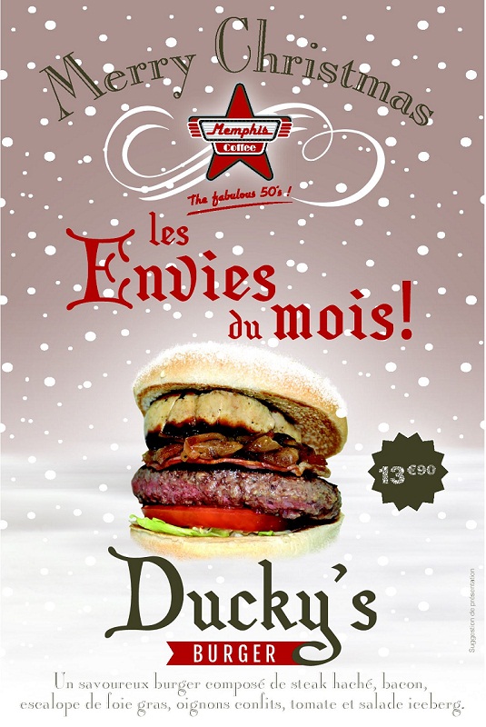 | Pour les fêtes, l’enseigne Memphis Coffee lance son Ducky’s Burger, en édition limitée jusqu’au 5 janvier prochain ! A base de foie gras, la recette est servie dans un pain Bun’s, accompagné d’un steak haché, de bacon grillé, de salade iceberg, de tomate et d’oignon frit. Le tout présenté, avec son accompagnement, au prix de 13,90€. Mais ce n’est pas tout ce que Memphis Coffee a prévu pour les fêtes : les restaurants ont adopté le thème “le Père Noël est un crooner”, avec une décoration et une programmation musicale plongeant les clients dans une ambiance de Noël made in USA ! De plus, les établissements seront ouverts les 24 et 31 décembre toute la journée, et les 25 décembre et 1er janvier à partir de 18h. Memphis Coffee développe son concept de diner’s à l’américaine depuis 2010 : l’enseigne regroupe actuellement 27 implantations. |