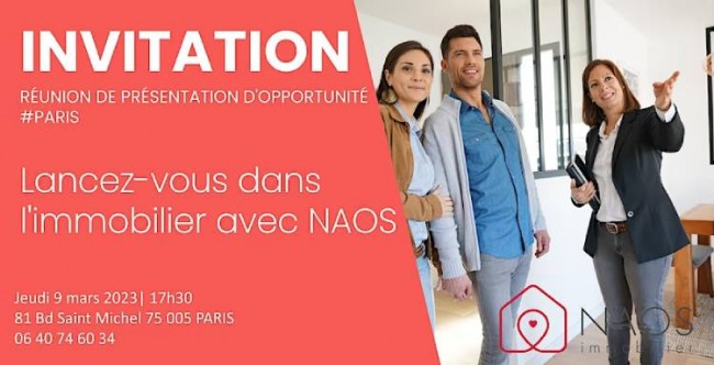 NAOS Immobilier organisera jeudi 9 mars à 17h30 une réunion d’information dans ses locaux parisiens pour présenter les avantages du métier de conseiller immobilier indépendant à de futurs mandataires.