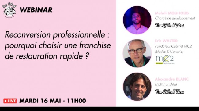Des experts du domaine seront présents pour discuter des clés d’une reconversion réussie dans la restauration rapide et de l’accompagnement que peut offrir une franchise comme New School Tacos. Eric Walter, fondateur du cabinet d’études et de conseil MC2, et Alexandre Blanc, entrepreneur et multi-franchisé New School Tacos, seront les deux intervenants de cet événement en ligne.