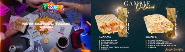 Cette dernière se compose en effet d’un Tacos Deluxe Saumon (saumon fumé, fromage frais Philadelphia, jus de citron, aneth, sauce gruyère maison et frites) et d’un Tacos Deluxe Truffé (cordon belu, sauce pomme frite, sauce gruyère maison, frites et gratiné pecorino à la truffe) : des produits d’exception qui évoquent les fêtes de fin d’année, le raffinement à la française et la gourmandise.