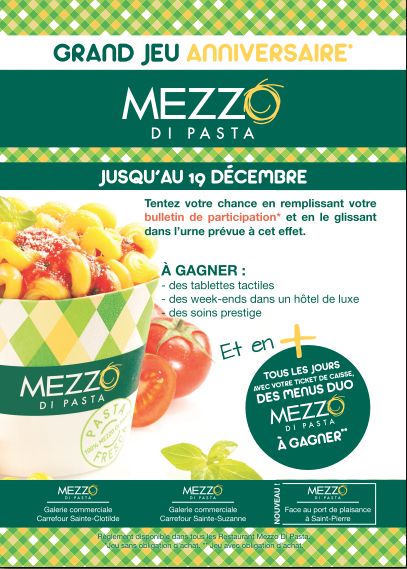 Autre bonne nouvelle pour les Réunionnais : jusqu’au 19 décembre, ces trois restaurants organisent un jeu anniversaire permettant de gagner des tablettes tactiles, des week-ends, des soins prestiges et des menus Mezzo di Pasta.