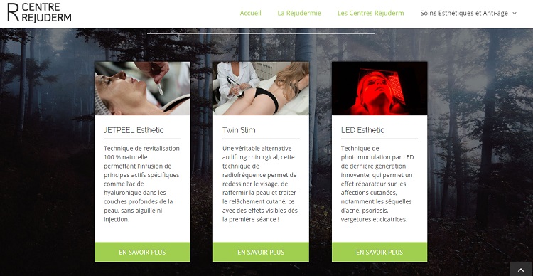 Moderne et ergonomique, l’interface permet d’obtenir toutes les informations utiles sur le concept, les techniques utilisées, les soins proposés, etc. Le procédé de la réjudermie, qui traite les effets du vieillissement cutané, est expliqué en détail, avec des focus sur les techniques Jetpeel esthetic, Twin Slim et LED esthetic.