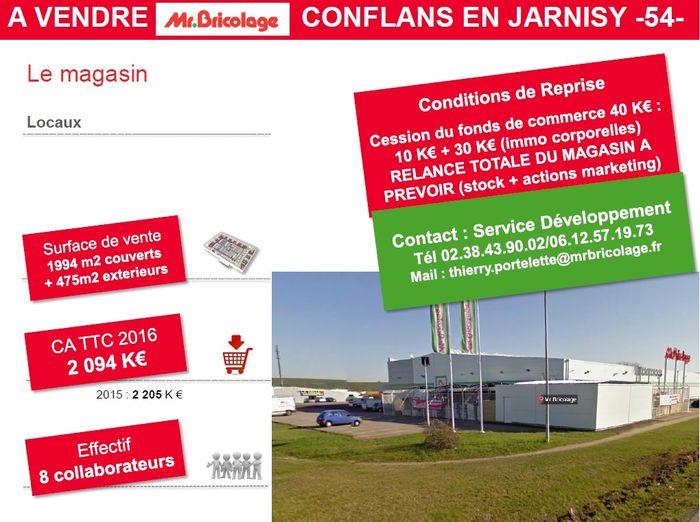 Pour reprendre le fonds de commerce du magasin Bricolage de Conflans-en-Jarnisy, les candidats devront disposer de 40k€ et prévoir des fonds pour assurer la relance du magasin. Le repreneur doit justifier de solides compétences en management et gestion, avoir un réel esprit commerçant et idéalement une bonne connaissance du tissu économique et social local.