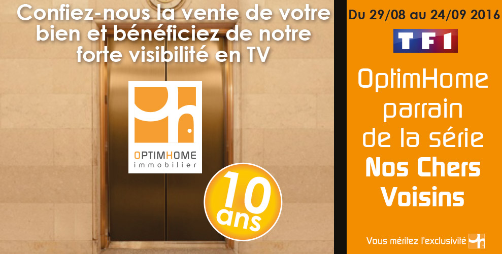 A l’occasion des 10 ans de l’enseigne, le réseau de franchise immobilière OptimHome lance une campagne média inédite sur TF1. L’enseigne parrainera en effet jusqu’au 24 septembre 2016 la célèbre série télévisée humoristique française « Nos Chers Voisins ».