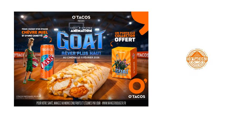 O’Tacos franchit une nouvelle étape dans sa stratégie de marque. Leader du French Tacos en France et en Europe, l’enseigne annonce son tout premier partenariat avec Sony Pictures Animation à l’occasion de la sortie officielle du film d’animation GOAT, prévue le 11 février.