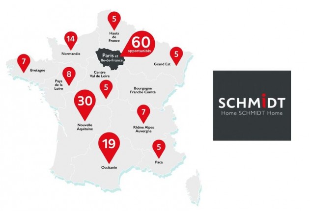 Pour parvenir à ce maillage des plus affinés, Schmidt souhaite recruter de nouveaux créateurs d’entreprise dans l’ensemble de la France, et particulièrement en Ile de France, qui reste la priorité incontestable du groupe, mais également en Nouvelle Aquitaine et en Occitanie. Ces trois régions regroupent à elles seules plus d’une centaine d’opportunités d’implantation. Viennent ensuite la Normandie, les Pays de la Loire, la Bretagne et l’Auvergne Rhône Alpes. Les Hauts de France, la région PACA, le Grand Est et le Centre Val de Loire disposent, elles, chacune de cinq opportunités d’implantation.