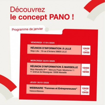 Découvrez les opportunités de franchise PANO et lancez-vous ! Tout au long de l’année, PANO organise des événements pour échanger avec les porteurs de projets et leur présenter son concept éprouvé ainsi que ses solutions d’accompagnement. En janvier, les premières dates à noter sont : · Lille : 17 janvier 2025 à 12h30 au Wojo Lille, 19 Rue d’Amiens, 59800 Lille Marseille : 22 janvier 2025 à 15h00 au Wojo Marseille 8ème - Mercure Prado Vélodrome, 11 avenue de Mazargues, 13008 Marseille En ligne : 30 janvier 2025 à 12h30, webinaire thématique “Femmes et Entrepreneuses”