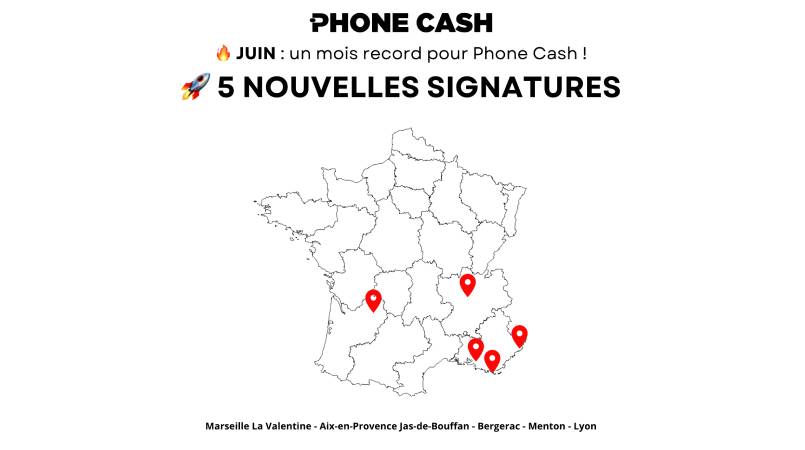 En ce mois de juin, Phone Cash renforce sa présence dans l’Hexagone avec cinq ouvertures prévues dans des zones stratégiques : « Marseille La Valentine », « Aix-en-Provence Jas-de-Bouffan », « Bergerac », « Menton » et « Lyon ». Ce développement soutenu témoigne de la dynamique de croissance du réseau, qui attire de plus en plus d’entrepreneurs sur le marché du reconditionné.