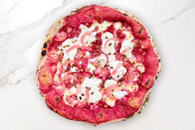 Composée sur une base crème de betterave, cuite lentement pour préserver sa douceur puis relevée, après cuisson, d’un cœur de burrata et de pickles d’oignon rouge, cette pizza éphémère, aux couleurs du mois de la lutte contre le cancer du sein, est également livrée dans une boîte spéciale.
